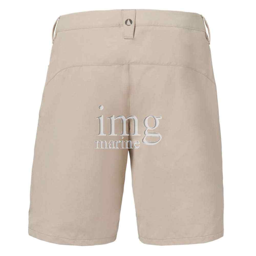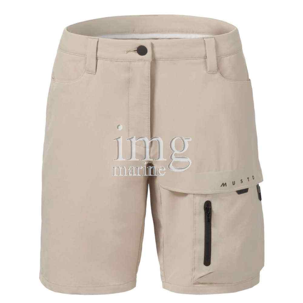 Pantaloncini Musto Evo Deck da donna: tessuto elasticizzato a rapida asciugatura, protezione UV UPF 40, quattro tasche con chiusura in Velcro, passanti per attrezzi. Colore Beige
