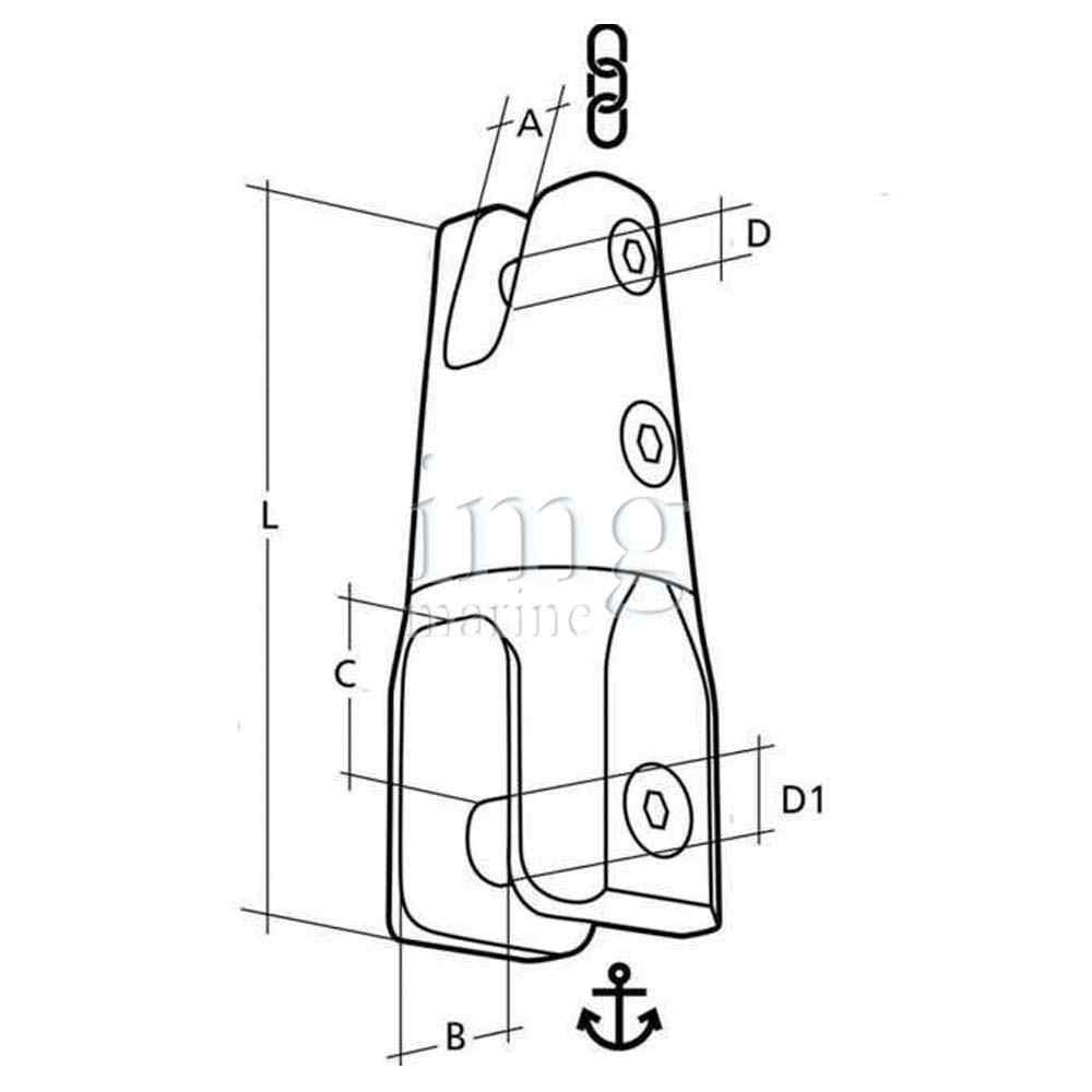 Giunto ancora SiderMarine G70 in acciaio inox forgiato, girevole, ispezionabile e ad alta resistenza. Ideale per catene e ancore con carichi elevati. Disponibile in due misure