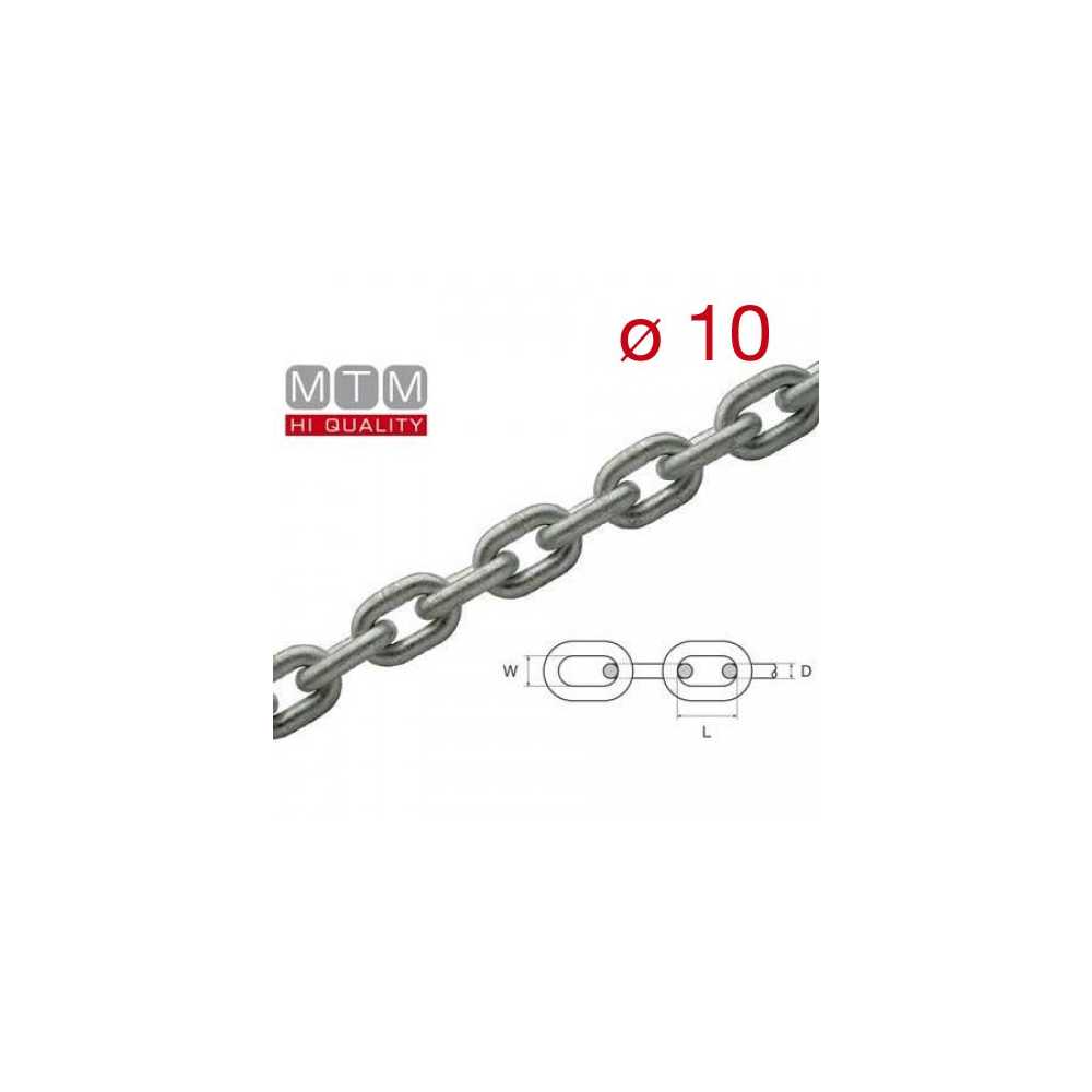 Catena calibrata in acciaio zincata a caldo G40 Ø 10 passo 30 mm ISO 4565, per verricelli. Prodotto di qualità importato da MTM in tese da 30-50-75-100 metri.