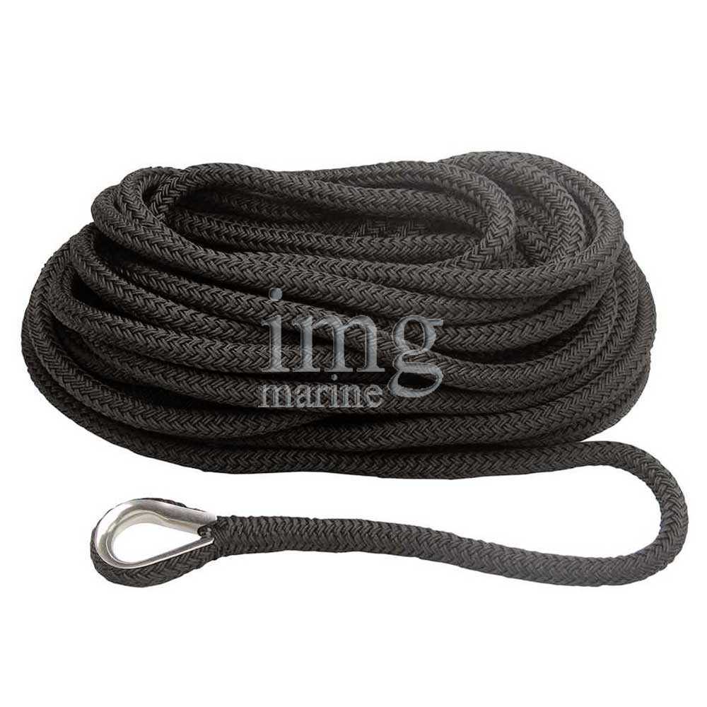 Cima a treccia da ormeggio in Poliestere di colore Nero ad alta tenacità, di qualità superiore, impiombata con redancia in Inox. Pronta per l'ormeggio e l'ancoraggio. Non galleggia. Misure da Ø 10 a Ø 24 mm.