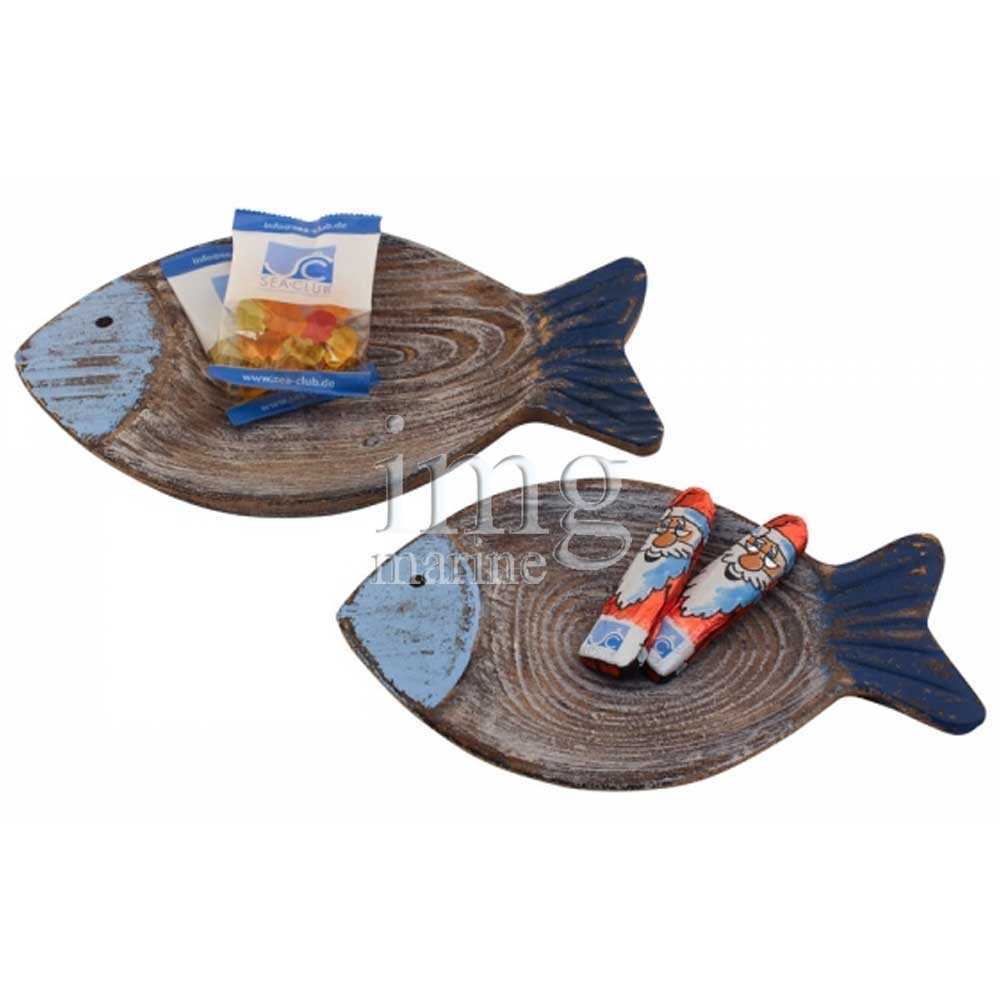Set di 2 svuotatasche in legno a forma di pesce di colore marrone con la testa grigia e la pinna blu