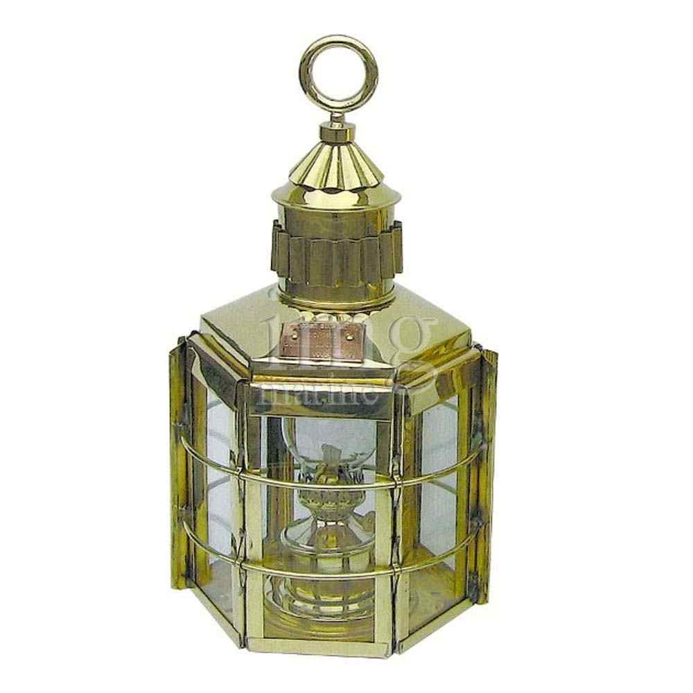 Lampada esagonale in ottone funzionante a petrolio, con manico, il vetro è protetto da una griglia.