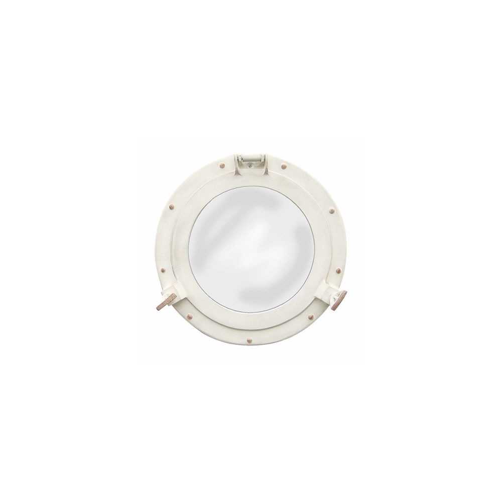 Specchio inserito in un oblò apribile in alluminio color avorio.