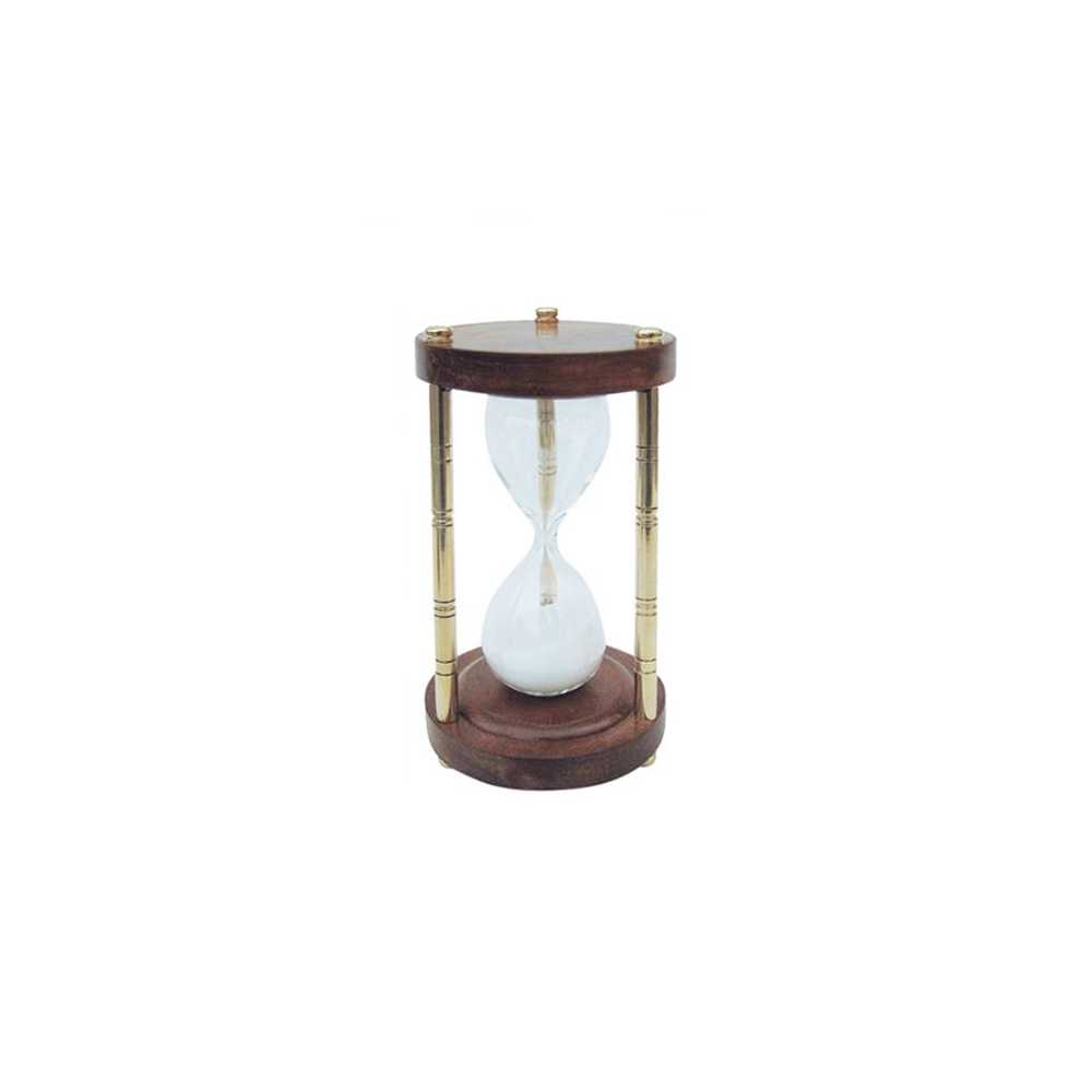 Clessidra in vetro soffiato con base in legno e tre colonne in ottone.