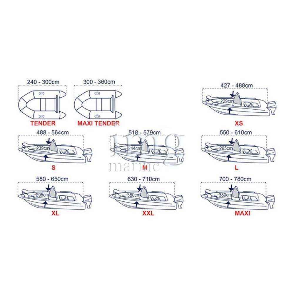 | Codice | Taglia | Barche L x Larg. max | Gommoni L x Larg. max | Colore | Cinghie |