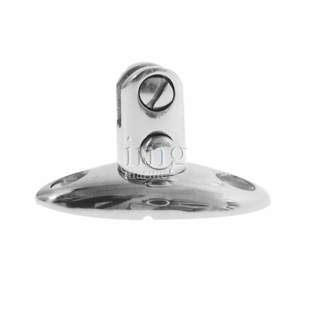 Base a forcella misura 75x35 mm con perno estraibile realizzata in acciaio Inox AISI 316, per il fissaggio di tendalini e capottine. Permette di togliere la capottina con la semplice pressione di un bottone.