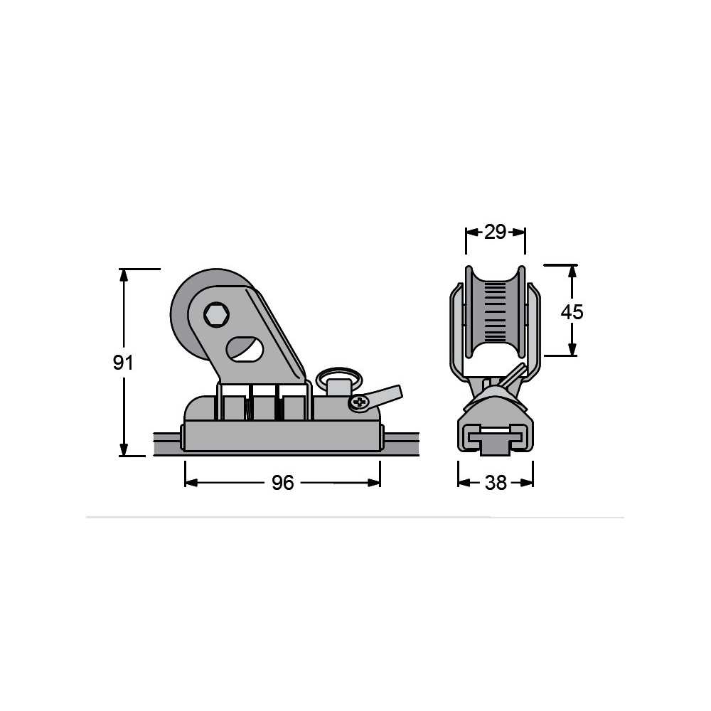 Carrello genoa serie 26x4 Antal, lungo 96 e largo 38 mm, ha un carico di lavoro SWL di 800 kg. Cursore in alluminio ossidato nero con fermo d’arresto in acciaio inox AISI 316 e pattini di scorrimento in nylon.