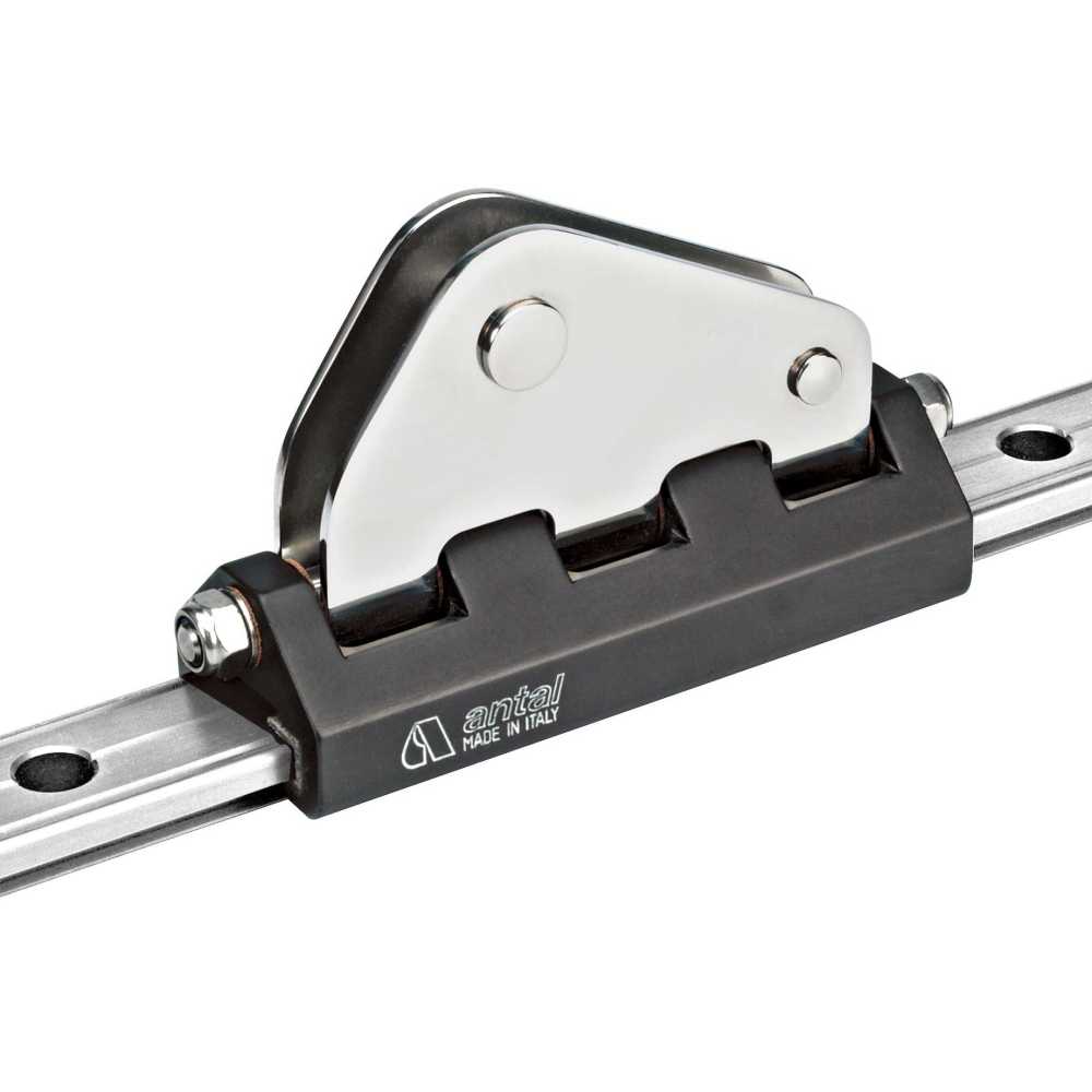 Carrello tesabase su fibra HS Antal autolubrificante per rotaia 32x6 adatto ad imbarcazioni fino a 45 piedi. Il carrello scorre su fibra HS autolubrificante che permette di raggiungere alti carichi di lavoro pur con dimensioni molto contenute; inoltre garantisce alta scorrevolezza e quindi facilità di manovra.