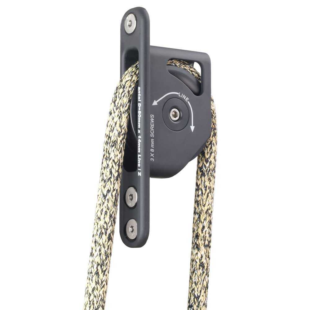 Pulegge in resina (in alluminio per 100 e 120 mm) con cuscinetto principale in fibra composita e doppio cuscinetto a sfere laterale.