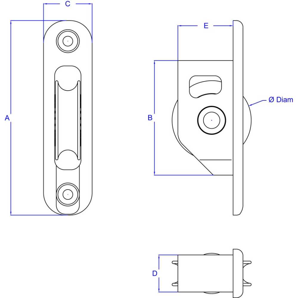 | Codice | Ø Puleggia mm | Ø Tessile mm | A mm | B mm | C mm | D mm | E mm | Carico di lavoro Kg | Viti di fissaggio |
