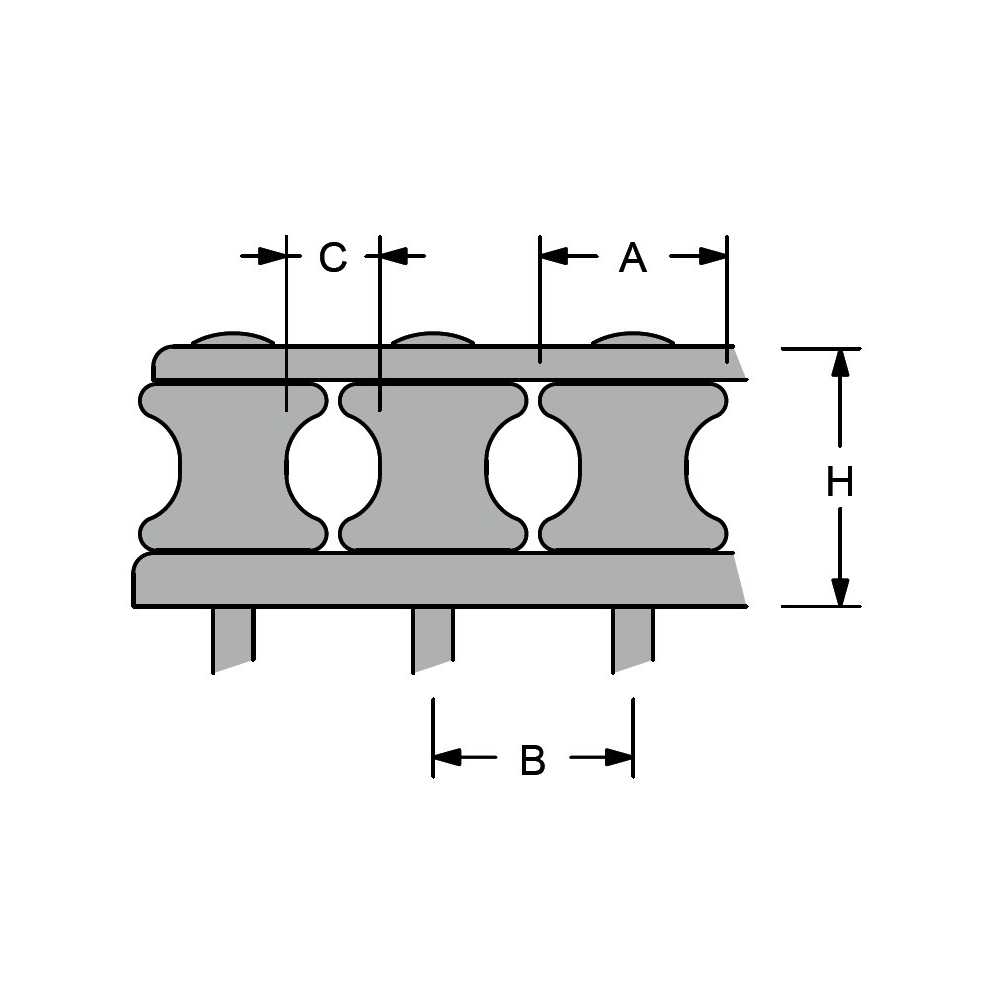 | Codice | n° Pulegge | Lunghezza mm | Peso kg | A mm | B mm | C mm | H mm | Viti di fissaggio |