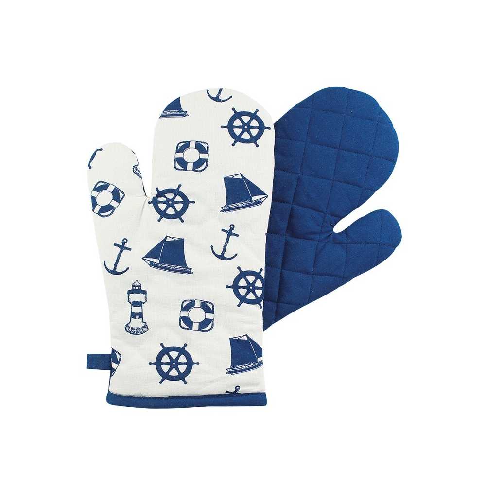 Guanto da forno in cotone 100 %. Il guanto è realizzato da un lato con tessuto stampato con decori in stile nautico e dall'altro tinta unita blu. Misure: 18x30 cm. Lavabile in lavatrice a 40°.