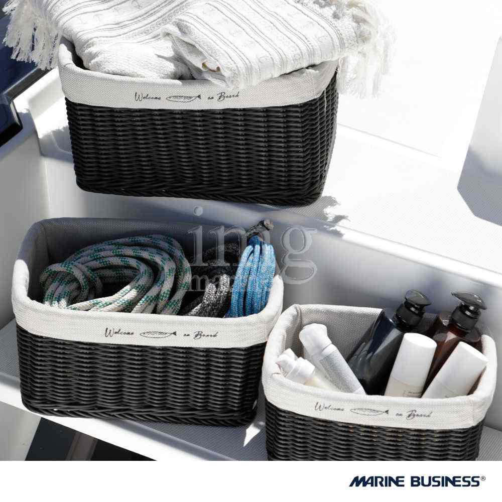 Realizzata in rattan sintetico colore nero con fodera interna removibile, colore Beige (100% polipropilene). Con ricamo in stile nautico.