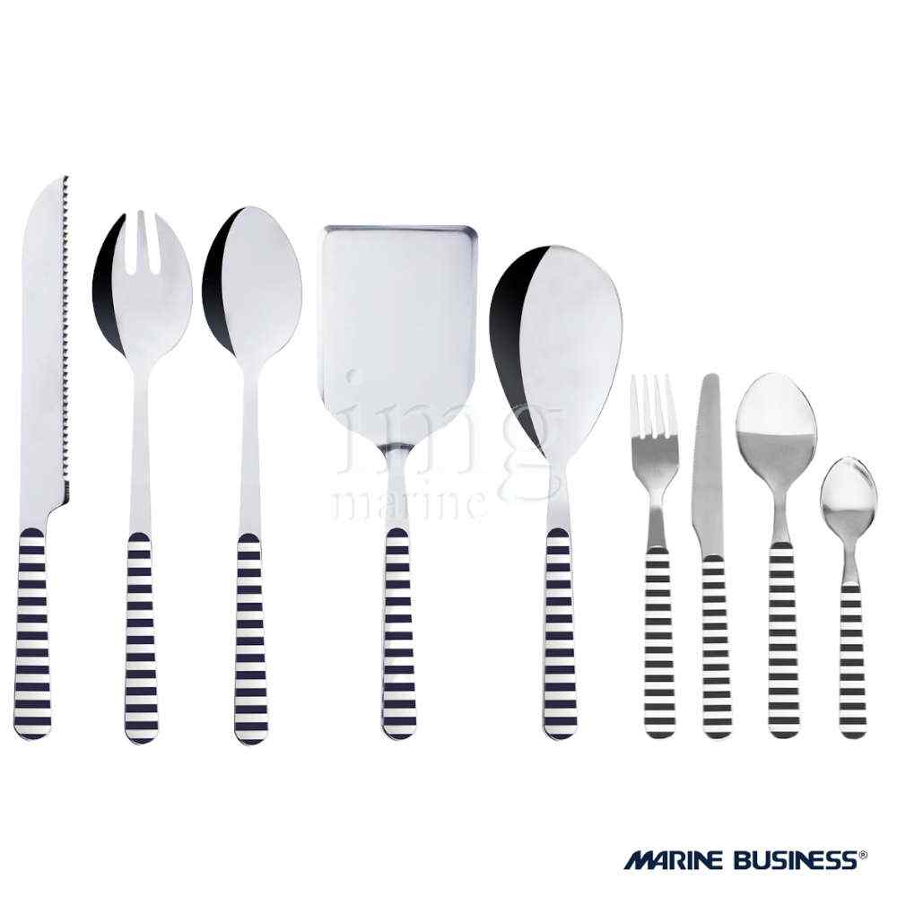 Le posate Premium Plus Stripes Blu sono realizzate in acciaio inox 18/10 di altissima qualità. Manico in ABS bianco con con righe blu di Marine Business. Set da 29 pezzi.