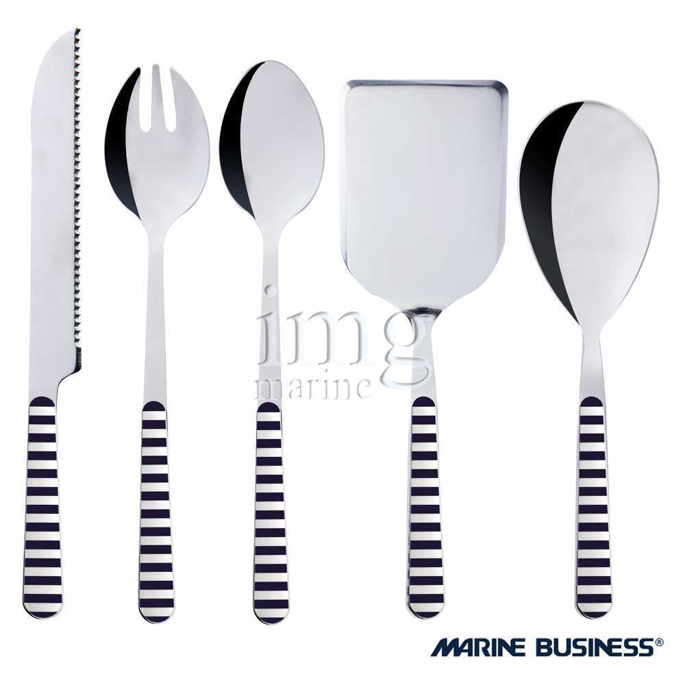 Posate in acciaio inox 18/10 di altissima qualità Stripes Blu con manico in ABS a righe Bianche e Blue Navy di Marine Business. Set da 5 pezzi.
