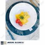 Confezione da 6 piatti piani serie Living di Marine Business infrangibili in melamina di alta qualità. Serie di piatti nelle tonalità del bianco del grigio tortora e del blue con varie decrazioni.