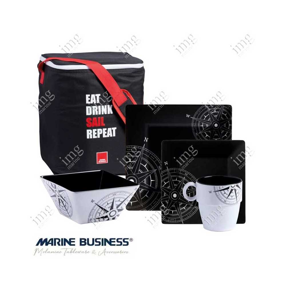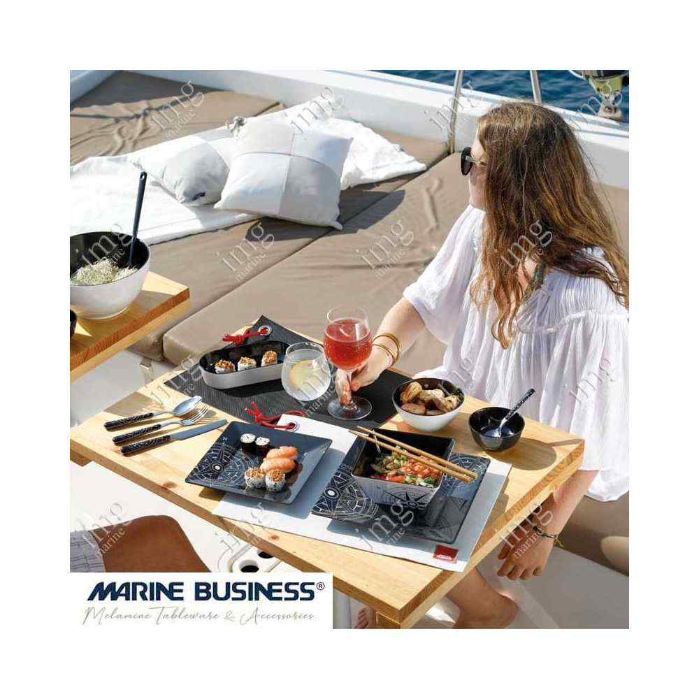 Servizio stoviglie da 25 pezzi serie Lombok di Marine Business in melamina di alta qualità. Serie di stoviglie di colore nero e bianco con rose dei venti. Per 6 persone.