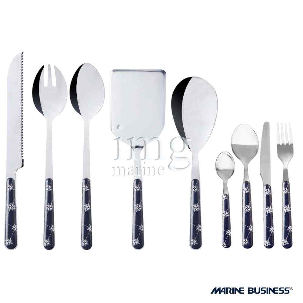 Le posate Premium Plus sono realizzate in acciaio inox 18/10 di altissima qualità con manico in ABS colore blu con decoro rosa dei venti, serie Northwind di Marine Business. Set da 29 pezzi.