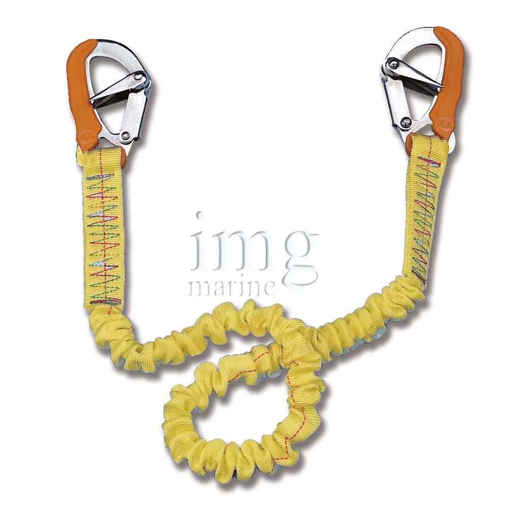Nastro di sicurezza ombelicale elastico Mistyk II per cinture CE ISO 12401. Munito di 2 moschettoni in acciaio inox AISI 316 autobloccanti. Direttiva D.P.I. 2016/425/UE. Omologato ISO 12401. Lunghezza <200 cm.