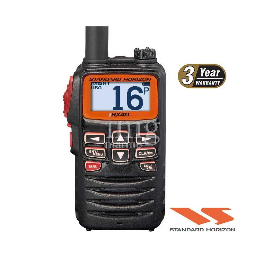 Ricetrasmettitore VHF HX40E Horizon portatile e ultra compatto IPX7. 6 Watt di potenza, con batteria Li-Po ad altissima durata e ricevitore radio broadcast FM. Garanzia di tre anni.