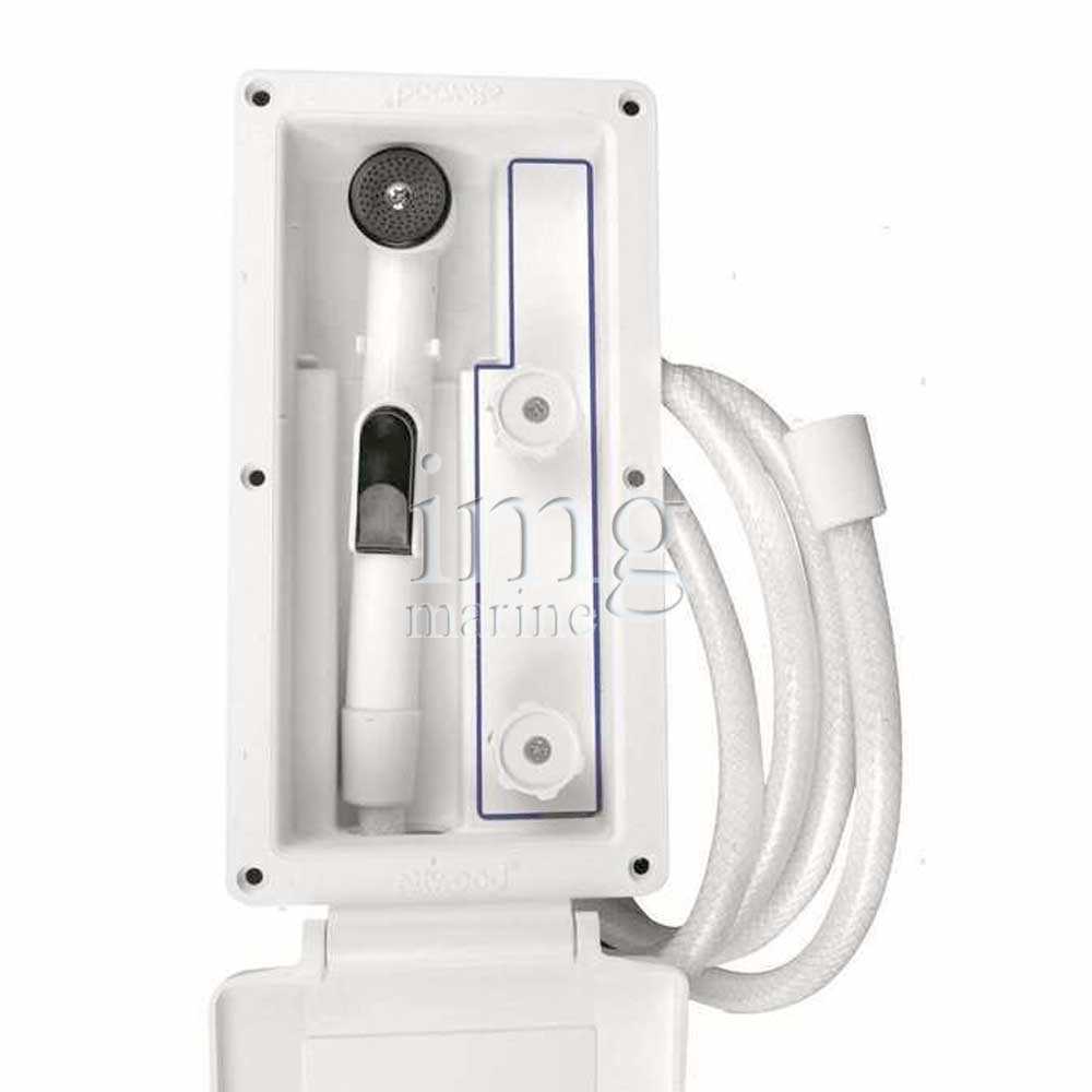 Da installare nello specchio di poppa,realizzato in plastica resistente ai raggi UV e al salino. Include coperchio incernierato, doccetta e tubo.