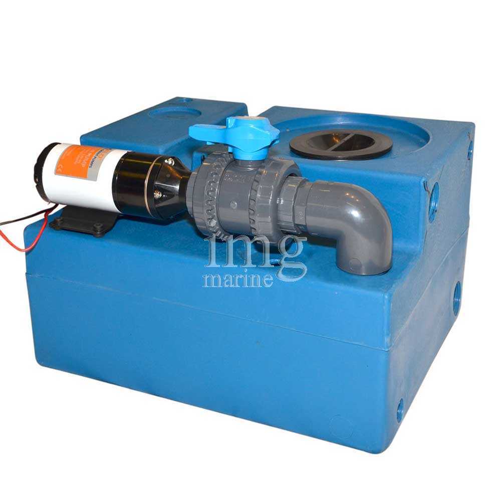 Serbatoio acque nere in Polietilene ad alta densità con impianto per lo svuotamento con pompa maceratore a 12V e raccordo da 38 mm, boccaporto ispezione, con passascafo di sfiato e sifone di scarico.