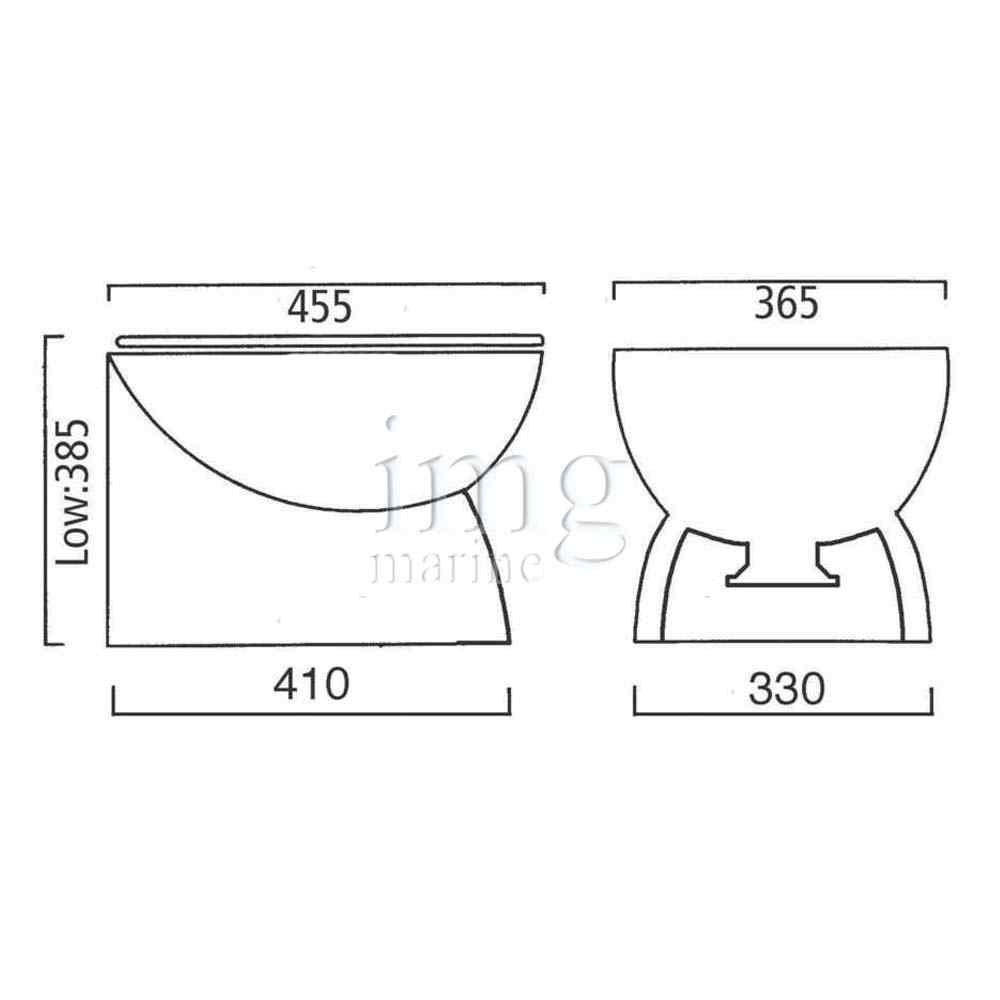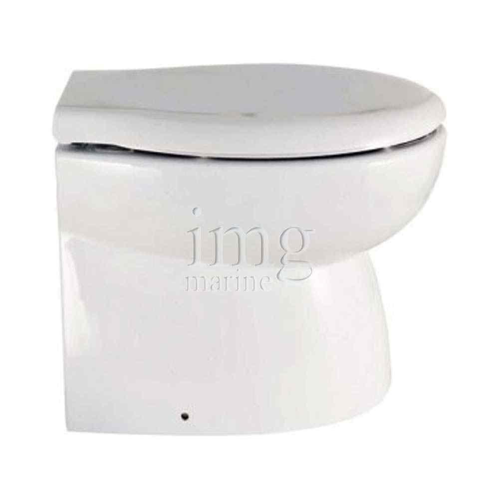 WC elettrico Ocean Luxury 12/24V con seduta comfort, scarico automatico, pompa combinata, soft-close e materiali anticorrosione. Per montaggio sopra o sotto galleggiamento. Altezza 385mm.