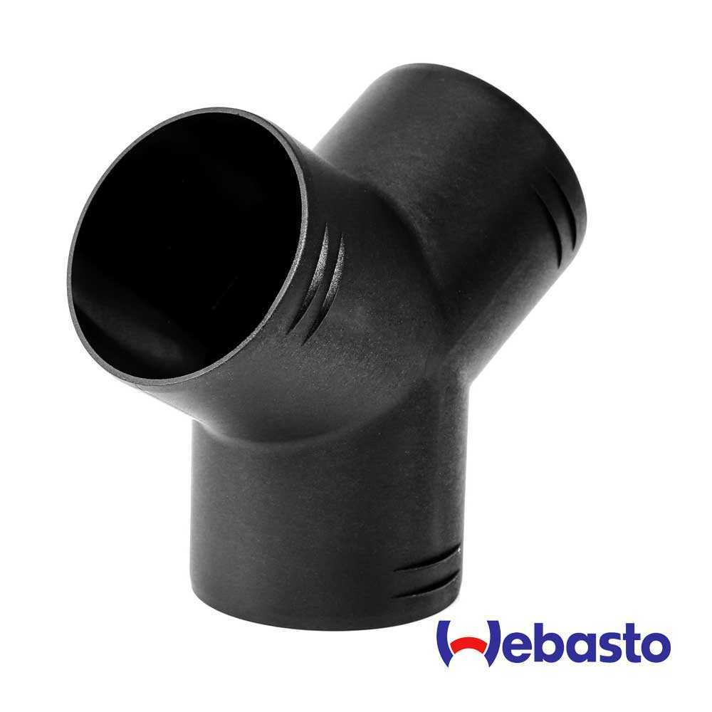 Raccordo di derivazione a Y. Realizzato in plastica rinforzata con fibra di vetro PA6.6 GF30. Resistente alle alte temperature +140 °C Diametro esterno: 90/90/90 mm.