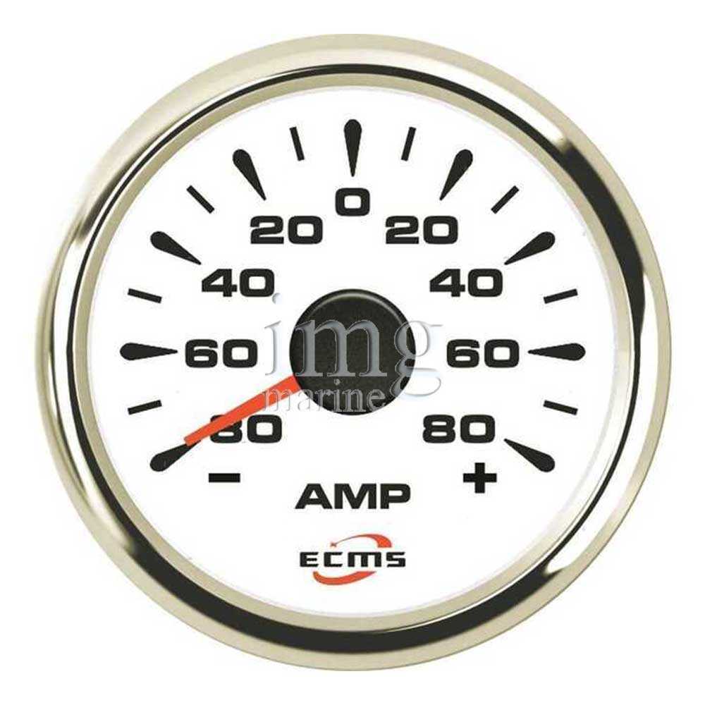 Amperometro con shunt ECMS per controllo dello stato della batteria. Cornice in acciaio inox 316. Frontalino impermeabile IP67 con lente bombata anti-appannamento. Quadrante retroilluminato a LED in vari colori.