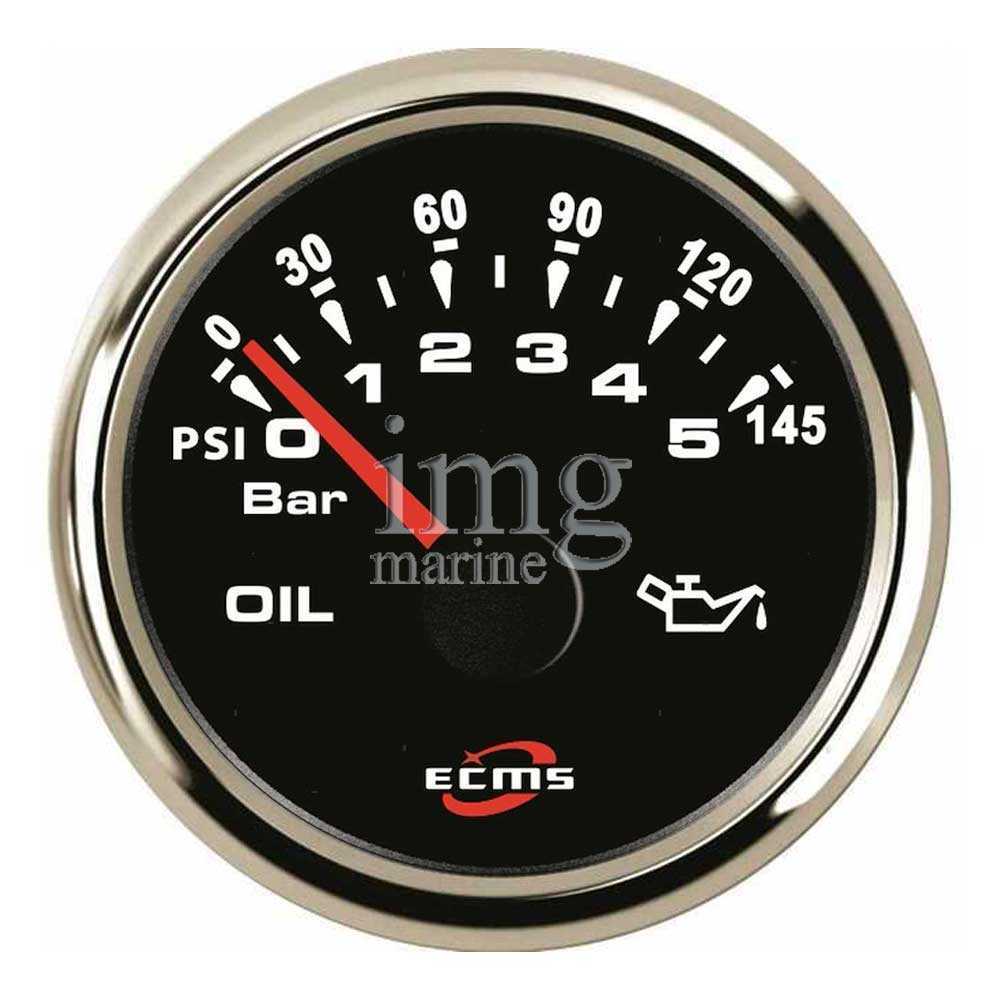 Indicatore della pressione dell'olio ECMS 9-32V con cornice in acciaio inox 316. Frontalino impermeabile IP67 con lente bombata anti-appannamento. Quadrante retroilluminato a LED in vari colori.