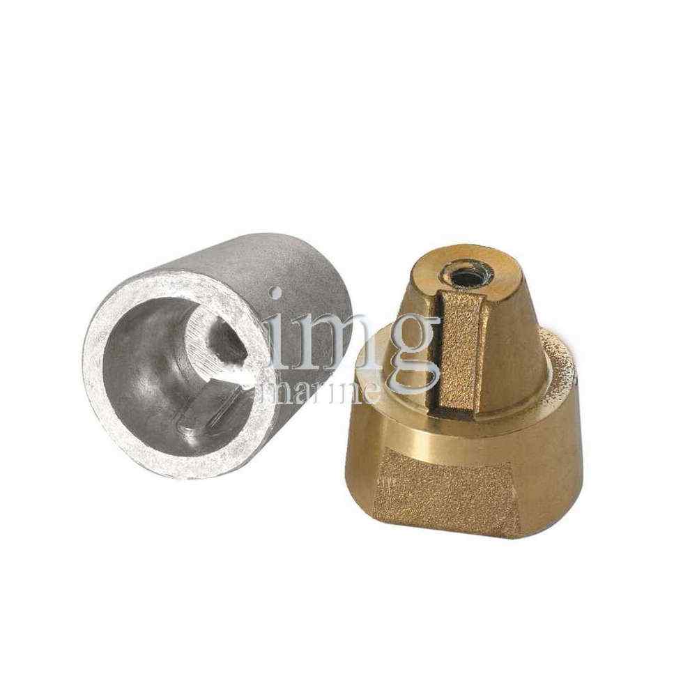 Anodo ogiva a cono mozzo filettato, interno conico, in ottone con anodo di Zinco per asse portaelica. Disponibile in varie misure da Ø25 a Ø50 mm.