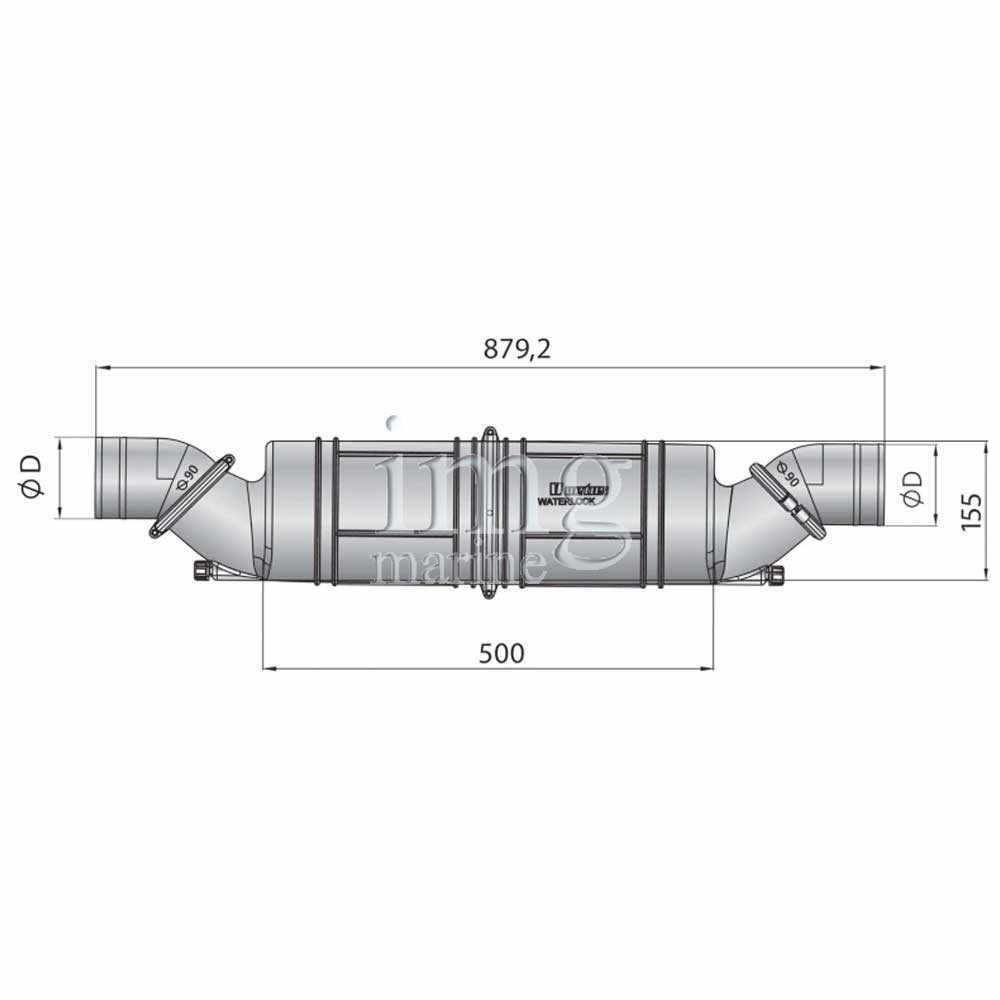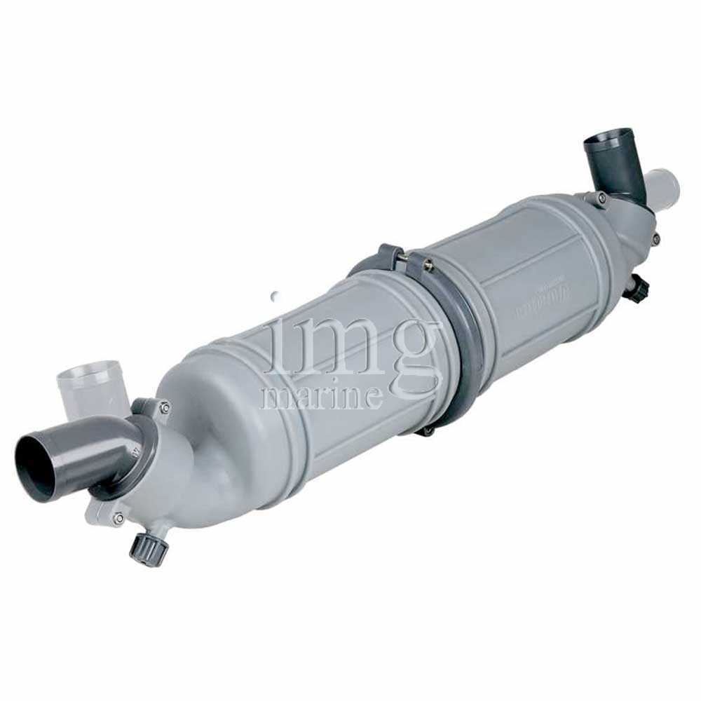 Marmitta silenziata a installazione orizzontale con corpi e raccordi rotanti per motori diesel entrobordo. La doppia camera abbatte drasticamente il livello del rumore. Capacità: 3 o 10 litri.